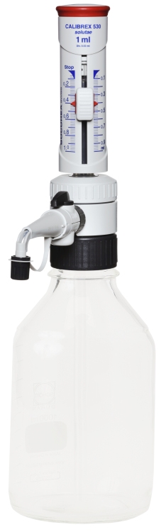 Socorex Calibrex solutae 530 instelbare dispensers met afsluitkraan. Grote prestaties en chemische bestendigheid, en tegelijkertijd onderhoudsarm. Sluit de loop makkelijk af tussen bedrijven door met de stopkraan.